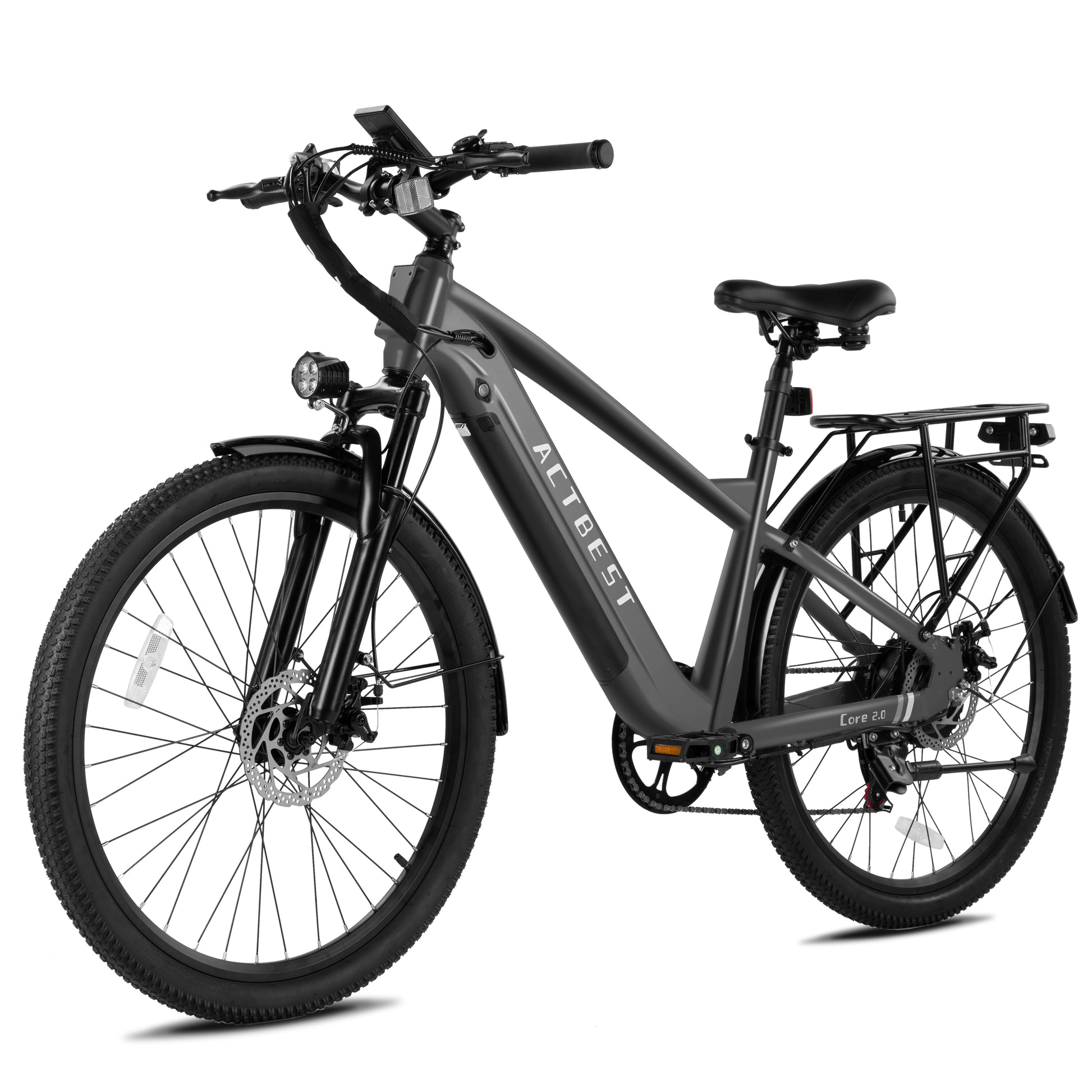 Dominate every ride. The Core 2.0 e-bike’s 750W peak brushless motor hits 20 mph—robust power for adventure and daily rides. It breezes up hills, navigates streets smoothly, accelerates responsively, and balances strength and efficiency for long rides. 48V 10.4Ah removable battery: a power wizard! 55 miles per charge—your ticket to endless rides. The tuned front fork suspension gobbles up bumps and cracks, squashing jolts for a silky ride—comfort and safety in one. Its optimized design and smart weight distribution work like a charm—safer, smoother rides.